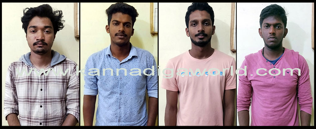 ಬಂಧಿತರನ್ನು ಮುಕ್ಕಾ ನಿವಾಸಿ ಕೆ.ಯು.ಶಮೀಲ್ (22), ಬೈಕಂಪಾಡಿ ನಿವಾಸಿ ಮೊಹಮ್ಮದ್ ಬಾಝಿಲ್ (22), ಮುಲ್ಕಿ ನಿವಾಸಿ ಸಂಭ್ರಮ್ ಆಲ್ವಾ (20) ಮತ್ತು ಕಲ್ಪನೆ ನಿವಾಸಿ ಅಶ್ವಿತ್ ಎನ್ ಜಾನ್ಸನ್ ( 21) ಎಂದು ಗುರುತಿಸಲಾಗಿದೆ. ಇವರೆಲ್ಲರೂ ಎಂಜಿನಿಯರಿಂಗ್ ವಿದ್ಯಾರ್ಥಿಗಳು ಎಂದು ತಿಳಿಸಿದ್ದಾರೆ.