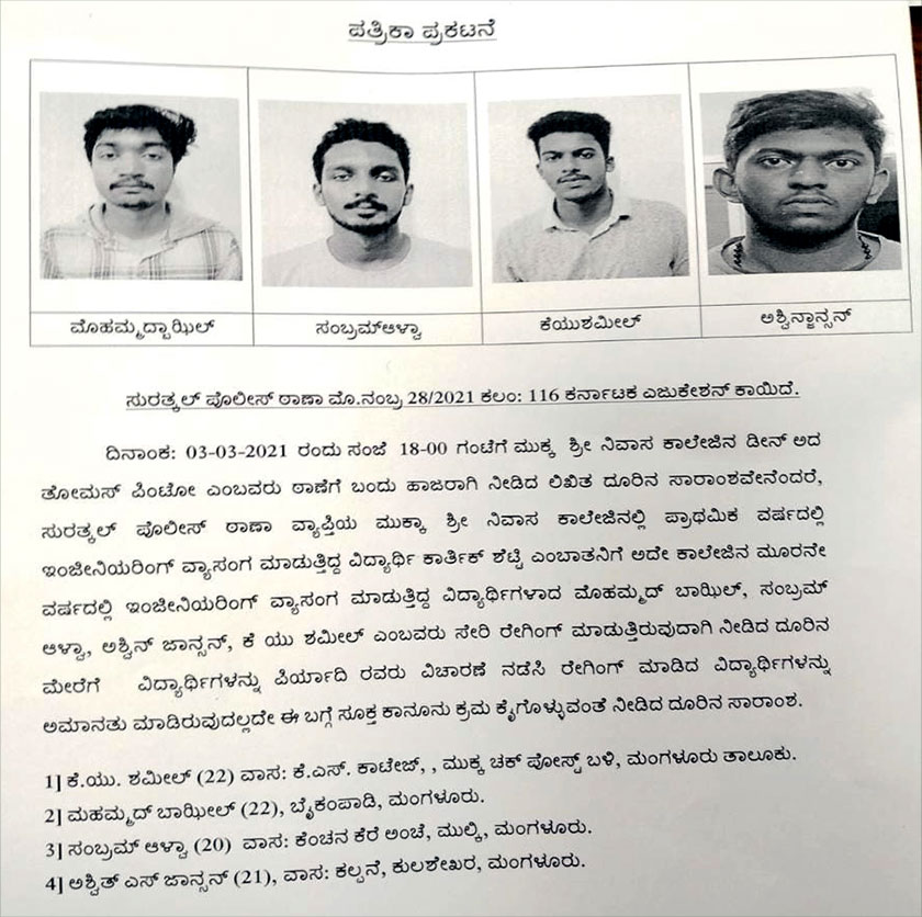 ಶುಕ್ರವಾರ ತಮ್ಮ ಕಚೇರಿಯಲ್ಲಿ ಪತ್ರಿಕಾಗೋಷ್ಠಿಯಲ್ಲಿ ಈ ಬಗ್ಗೆ ಮಾಹಿತಿ ನೀಡಿದ ಅವರು, ಸುರತ್ಕಲ್ ಸಮೀಪದ ಮುಕ್ಕಾದಲ್ಲಿನ ಶ್ರೀನಿವಾಸ ಕಾಲೇಜಿನಲ್ಲಿ ಮಾರ್ಚ್ 3 ರಂದು ಕಾಲೇಜಿನ ಮುಖ್ಯಸ್ಥರು ನಾಲ್ಕು ಹಿರಿಯ ವಿದ್ಯಾರ್ಥಿಗಳು ಪ್ರಥಮ ವರ್ಷದ ವಿದ್ಯಾರ್ಥಿಯನ್ನು ರ್ಯಾಗಿಂಗ್ ಮಾಡಿದ್ದಾರೆ. ಆರೋಪಿಗಳು ಕಿರಿಯ ವಿದ್ಯಾರ್ಥಿಗಳಿಗೆ ಬೆದರಿಕೆ ಹಾಕಿ ನಿಂದಿಸಿದ್ದಾರೆ. ಅಮಾನವೀಯವಾಗಿ ವರ್ತಿಸಿದ್ದಾರೆ ಎಂದು ದೂರು ದಾಖಲಿಸಿದ್ದರು.