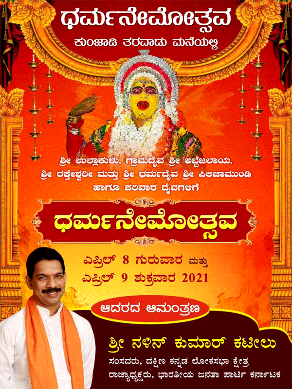 ಮಂಗಳೂರು, ಏಪ್ರಿಲ್.08: ಬಿಜೆಪಿ ರಾಜ್ಯಾಧ್ಯಕ್ಷ ಹಾಗೂ ಸಂಸದ ನಳಿನ್ ಕುಮಾರ್ ಕಟೀಲ್ರವರ ಕುಟುಂಬದ ಪುತ್ತೂರು ತಾಲೂಕಿನ ಪಾಲ್ತಾಡಿ ಗ್ರಾಮದ ಕೆಳಗಿನ ಕುಂಜಾಡಿ ತರವಾಡು ಮನೆಯಲ್ಲಿ ಏ.8 ಮತ್ತು ಏ.9ರಂದು ಧರ್ಮ ನೇಮೋತ್ಸವ ಧಾರ್ಮಿಕ ವಿಧಿವಿಧಾನಗಳೊಂದಿಗೆ ನಡೆಯಲಿದೆ.