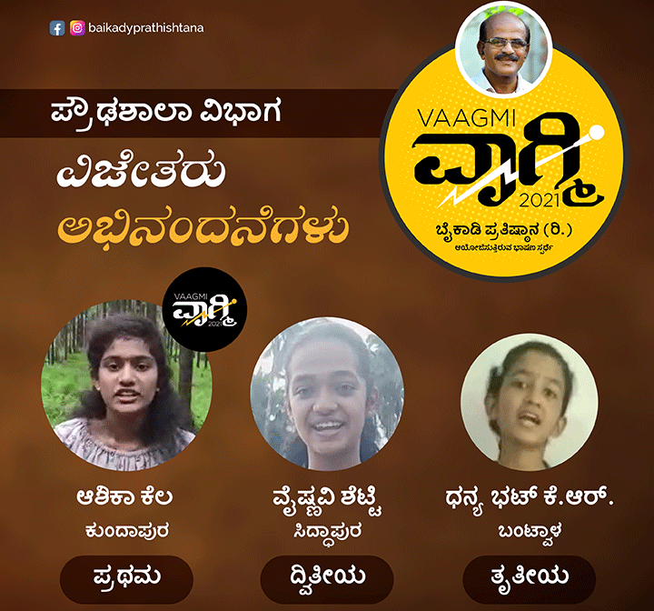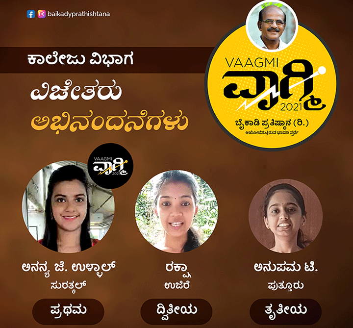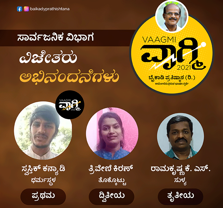 ಮಂಗಳೂರು : ಬೈಕಾಡಿ ಪ್ರತಿಷ್ಠಾನವು ಪೂಜ್ಯ ಬೈಕಾಡಿ ಜನಾರ್ದನ ಆಚಾರ್ ಇವರ ಬದುಕಿನ ಭಾವ ಮತ್ತು ಭಾಗವಾಗಿದ್ದ ‘ಭಾಷಣ ಕಲೆ’ಯ ಉತ್ತೇಜನಕ್ಕಾಗಿ ಹಮ್ಮಿಕೊಂಡ ‘ವಾಗ್ಮಿ’ 2021 ಭಾಷಣ ಸ್ಪರ್ಧೆಯ ವಿಜೇತರುಗಳು ಹೆಸರನ್ನು ನಿಮ್ಮೊಂದಿಗೆ ಹಂಚಿಕೊಳ್ಳುತ್ತಿದ್ದೇವೆ. ಈ ಸ್ಪರ್ಧೆಯು ಪ್ರೌಢಶಾಲಾ, ಕಾಲೇಜು ಹಾಗೂ ಸಾರ್ವಜನಿಕ ಎಂಬ 3 ವಿಭಾಗಗಳಲ್ಲಿ ನಡೆದಿದ್ದು, ರಾಜ್ಯ ಹಾಗೂ ಹೊರರಾಜ್ಯಗಳಿಂದ 350ಕ್ಕೂ ಹೆಚ್ಚಿನ ಸಂಖ್ಯೆಯಲ್ಲಿ ಸ್ಪರ್ಧಿಗಳು ಭಾಗವಹಿಸಿದ್ದರು. ಪ್ರತೀ ವಿಭಾಗದಿಂದ 10 ಸ್ಪರ್ಧಿಗಳನ್ನು ಅಂತಿಮ ಸುತ್ತಿಗೆ ಆಯ್ಕೆ ಮಾಡಲಾಗಿತ್ತು ಎಂದು ಬೈಕಾಡಿ ಪ್ರತಿಷ್ಠಾನದ ಕಾರ್ಯದರ್ಶಿ ಭರತ್ ರಾಜ್ ಬೈಕಾಡಿ ತಿಳಿಸಿದ್ದಾರೆ.
