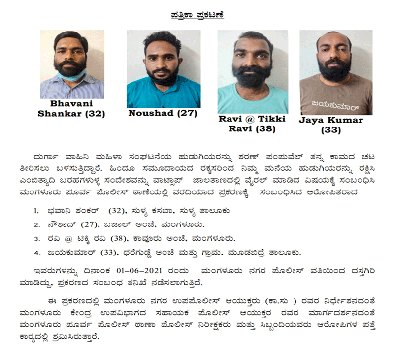 ಮಂಗಳೂರು, ಜೂನ್.02: ವಿಶ್ವ ಹಿಂದೂ ಪರಿಷದ್ ವಿಭಾಗ ಕಾರ್ಯದರ್ಶಿ ಶರಣ್ ಪಂಪುವೆಲ್ ಬಗ್ಗೆ ವಾಟ್ಸಪ್ಪ್ ಗ್ರೂಪ್ ನಲ್ಲಿ ಮತ್ತು ಸಾಮಾಜಿಕ ಜಾಲ ತಾಣಗಳಲ್ಲಿ ಮಾನಹಾನಿಕಾರಕ ಮತ್ತು ಅವಹೇಳನಕಾರಿ ಸಂದೇಶವನ್ನು ರವಾನಿಸಿರುವ ಪ್ರಕರಣಕ್ಕೆ ಸಂಬಂಧಿಸಿದಂತೆ ನಾಲ್ವರು ಆರೋಪಿಗಳನ್ನು ಬಂಧಿಸಲಾಗಿದೆ ಎಂದು ಮಂಗಳೂರು ನಗರ ಪೊಲೀಸ್ ಆಯುಕ್ತ ಎನ್. ಶಶಿಕುಮಾರ್ ತಿಳಿಸಿದ್ದಾರೆ.