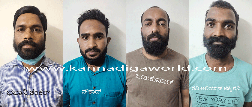 ಬಜಾಲ್ನ ನೌಶಾದ್ (27), ಮೂಡಬಿದ್ರೆಯ ಜಯಕುಮಾರ್ (33), ಸುಳ್ಯ ಕಸಬಾ ತಾಲೂಕಿನ ಭವಾನಿ ಶಂಕರ್ (32) ಹಾಗೂ ಕಾವೂರಿನ ರವಿ ಅಲಿಯಾಸ್ ಟಿಕ್ಕಿ ರವಿ (38) ಬಂಧಿತ ಆರೋಪಿಗಳು.