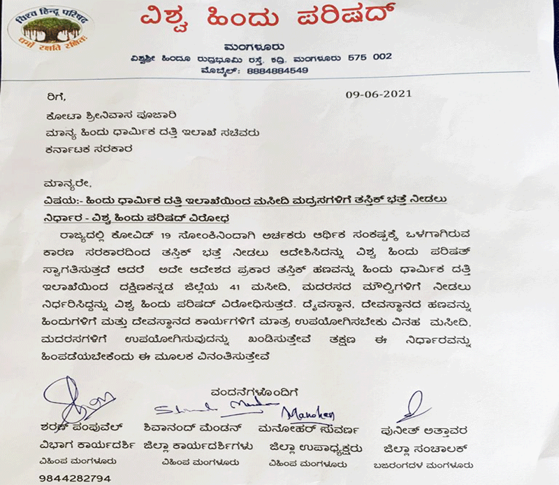 ರಾಜ್ಯದಲ್ಲಿ ಕೋವಿಡ್ 19 ಸೋಂಕಿನಿಂದಾಗಿ ಅರ್ಚಕರು ಆರ್ಥಿಕ ಸಂಕಷ್ಟಕ್ಕೆ ಒಳಗಾಗಿರುವ ಕಾರಣ ಸರಕಾರದಿಂದ ತಸ್ತಿಕ್ ಭತ್ತೆ ನೀಡಲು ಆದೇಶಿಸಿದನ್ನು ವಿಶ್ವ ಹಿಂದು ಪರಿಷತ್ ಸ್ವಾಗತಿಸುತ್ತದೆ. ಆದರೆ ಅದೇ ಆದೇಶದ ಪ್ರಕಾರ ತಸ್ತಿಕ್ ಹಣವನ್ನು ಹಿಂದು ಧಾರ್ಮಿಕ ದತ್ತಿ ಇಲಾಖೆಯಿಂದ ದಕ್ಷಿಣಕನ್ನಡ ಜಿಲ್ಲೆಯ 41 ಮಸೀದಿ, ಮದರಸದ ಮೌಲ್ವಿಗಳಿಗೆ ನೀಡಲು ನಿರ್ಧರಿಸಿದ್ದನ್ನು ವಿಶ್ವ ಹಿಂದು ಪರಿಷದ್ ವಿರೋಧಿಸುತ್ತದೆ.