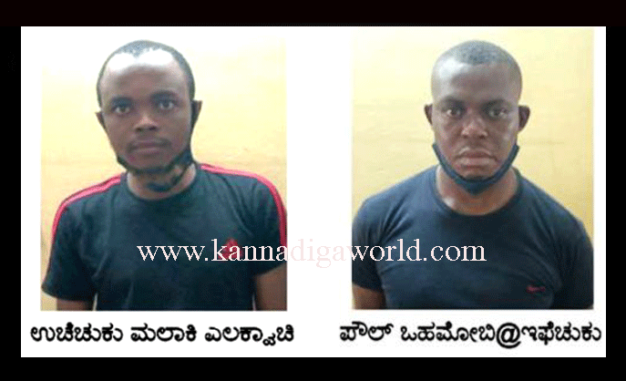 ನಗರದ ಕೊಣಾಜೆ ಪೊಲೀಸ್ ಠಾಣಾ ವ್ಯಾಪ್ತಿಯ ಡ್ರಗ್ಸ್ ಮಾರಾಟ ಪ್ರಕರಣದಲ್ಲಿ ನೈಜೀರಿಯಾ ಪ್ರಜೆಗಳಾದ ಪೌಲ್ ಒಹಮೋಬಿ ಯಾನೆ ಇಫೆಚುಕು ಮತ್ತು ಉಚೆಚುಕು ಮಲಾಕಿ ಎಲಕ್ವಾಚಿ ಎಂಬವರನ್ನು ಮಂಗಳೂರು ಪೊಲೀಸರು ಬೆಂಗಳೂರಿನ ಬಿದರಹಳ್ಳಿಯಲ್ಲಿ ವಶಕ್ಕೆ ಪಡೆದಿದ್ದಾರೆ.
