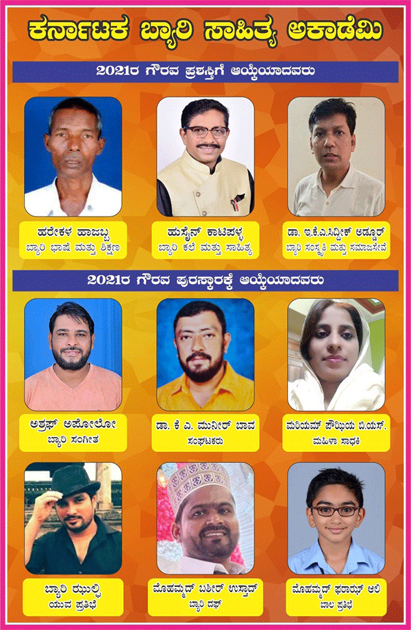 ಮಂಗಳೂರು : ಕರ್ನಾಟಕ ಬ್ಯಾರಿ ಸಾಹಿತ್ಯ ಅಕಾಡೆಮಿಯು 2021ನೇ ಸಾಲಿನ ಗೌರವ ಪ್ರಶಸ್ತಿಗೆ ಅಯ್ಕೆಯಾದವರ ಹೆಸರನ್ನು ಪ್ರಕಟಿಸಿದೆ.