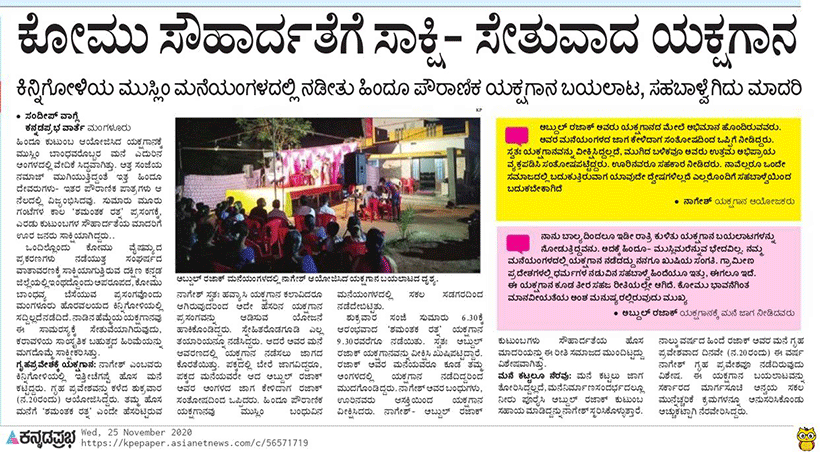 ಕನ್ನಡ ಪ್ರಭ ದಿನ ಪತ್ರಿಕೆಯಲ್ಲಿ 2020, ನವಂಬರ್ 25ರಂದು ಪ್ರಕಟಗೊಂಡ ಸಂದೀಪ್ ವಾಗ್ಲೆ ಅವರ ವರದಿ ‘ಕೋಮು ಸೌಹಾರ್ದ ತೆಗೆ ಸಾಕ್ಷಿ-ಸೇತುವಾದ ಯಕ್ಷಗಾನ’ ಎಂಬ ವರದಿಗೆ ಪ್ರಶಸ್ತಿ ಲಭಿಸಿದೆ. ಪ್ರಶಸ್ತಿಯು ರೂ. 5,001 ನಗದು, ಪ್ರಶಸ್ತಿ ಪತ್ರ ಮತ್ತು ಸ್ಮರಣಿಕೆಯನ್ನು ಒಳಗೊಂಡಿರುತ್ತವೆ ಎಂದು ದ.ಕ.ಜಿಲ್ಲಾ ಕಾರ್ಯನಿರತ ಪತ್ರಕರ್ತರ ಸಂಘದ ಪ್ರಧಾನ ಕಾರ್ಯದರ್ಶಿ ಇಬ್ರಾಹಿಂ ಅಡ್ಕಸ್ಥಳ ಪತ್ರಿಕಾ ಪ್ರಕಟಣೆಯಲ್ಲಿ ತಿಳಿಸಿದ್ದಾರೆ.