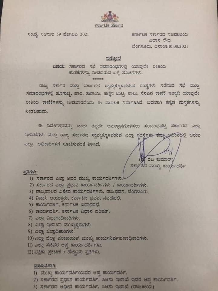 ಸಭೆಯೊಂದಕ್ಕೆ ಬಂದಿದ್ದ ವೇಳೆ ಸಿಎಂ ಬಸವರಾಜ ಬೊಮ್ಮಾಯಿ ಈ ಆದೇಶವನ್ನು ಮೌಖಿಕವಾಗಿ ಹೇಳಿದ್ದು ತಕ್ಷಣ ರಾಜ್ಯ ಸರ್ಕಾರದ ಮುಖ್ಯ ಕಾರ್ಯದರ್ಶಿ ಪಿ. ರವಿಕುಮಾರ್ ಅವರು ಸರ್ಕಾರಿ ಆದೇಶ ಜಾರಿ ಮಾಡಿದರು. ಇನ್ನು ಮುಂದೆ ಹೂ ಗುಚ್ಚದ ಬದಲಿಗೆ ಕನ್ನಡ ಪುಸ್ತಕಗಳನ್ನು ಕಾಣಿಕೆಯಾಗಿ ನೀಡಬಹುದು ಎಂದು ಆದೇಶದಲ್ಲಿ ತಿಳಿಸಲಾಗಿದೆ.