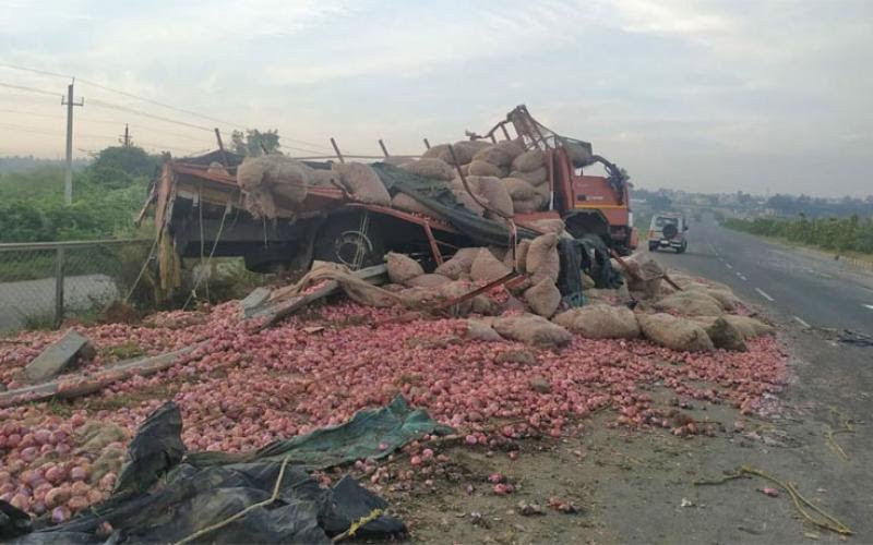 ಲಾರಿ ಪಲ್ಟಿಯಾಗಿದ್ದರಿಂದ ಹಿಂಬದಿಯಿಂದ ಬರುತ್ತಿದ್ದ ಕಾರು, ಆರು ಲಾರಿ ಡಿಕ್ಕಿ ಹೊಡೆದು ಸರಣಿ ಅಪಘಾತವುಂಟಾಗಿ 10 ಮಂದಿ ಗಾಯಗೊಂಡಿದ್ದಾರೆ. ಅವರನ್ನು ಆಸ್ಪತ್ರೆಗೆ ದಾಖಲಿಸಿ ಚಿಕಿತ್ಸೆ ನೀಡಲಾಗುತ್ತಿದೆ.