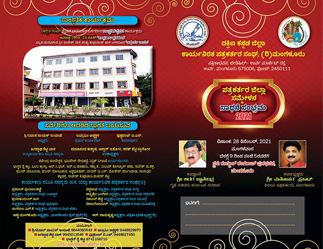 ಮಂಗಳೂರು: ದ.ಕ.ಜಿಲ್ಲಾ ಕಾರ್ಯನಿರತ ಪತ್ರಕರ್ತರ ಸಂಘ ಇದರ ಆಶ್ರಯದಲ್ಲಿ ಜಿಲ್ಲಾ ಪತ್ರಕರ್ತರ ಸಮ್ಮೇಳನ ಸಾಧನೆ ಸಂಭ್ರಮ-2021 28 ಡಿಸೆಂಬರ್ 2021ಮಂಗಳವಾರ, ಬೆಳಗ್ಗೆ 10ರಿಂದ ಸಂಜೆ 4:30ರ ತನಕ ಕುದ್ಮುಲ್ ರಂಗರಾವ್ ಪುರಭವನದಲ್ಲಿ ನಡೆಯಲಿದೆ.