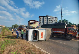 ಸಿದ್ದಾಪುರದಿಂದ ಮಂಗಳೂರಿಗೆ ಅಡಿಕೆ ಸಾಗಾಟ ಮಾಡುತ್ತಿದ್ದ ಟೆಂಪೋದ ಟಯರ್ ಮಾರ್ಗ ಮಧ್ಯೆ ಸ್ಫೋಟಗೊಂಡ ಪರಿಣಾಮ ಚಾಲಕನ ನಿಯಂತ್ರಣ ತಪ್ಪಿ ಟೆಂಪೋ ಫ್ಲೈಓವರ್ನಲ್ಲಿ ಉರುಳಿ ಬಿದ್ದಿದೆ.