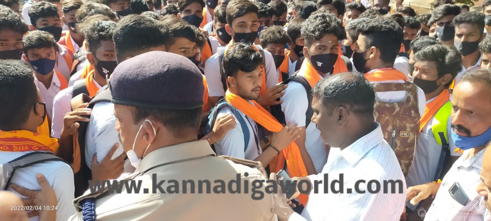 ಕಾಲೇಜು ಆವರಣದೊಳಕ್ಕೆ ಪ್ರವೇಶಿಸುವಂತಿಲ್ಲ ಎಂದು ಪ್ರಾಂಶುಪಾಲರು ಸೂಚಿಸಿದ ಹೊರತಾಗಿಯೂ ವಿದ್ಯಾರ್ಥಿಗಳು ಗೇಟ್ ತಳ್ಳಿ ಒಳಕ್ಕೆ ಪ್ರವೇಶಿಸಿ ಕಾಲೇಜು ಆವರಣದಲ್ಲಿ ಇರಲು ಅವಕಾಶ ನೀಡುವಂತೆ ಆಗ್ರಹಿಸಿದರು.