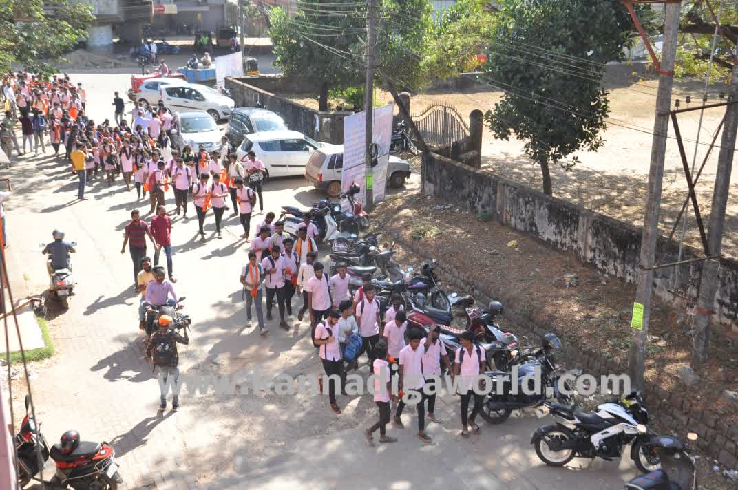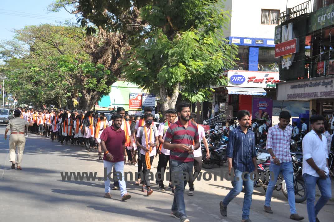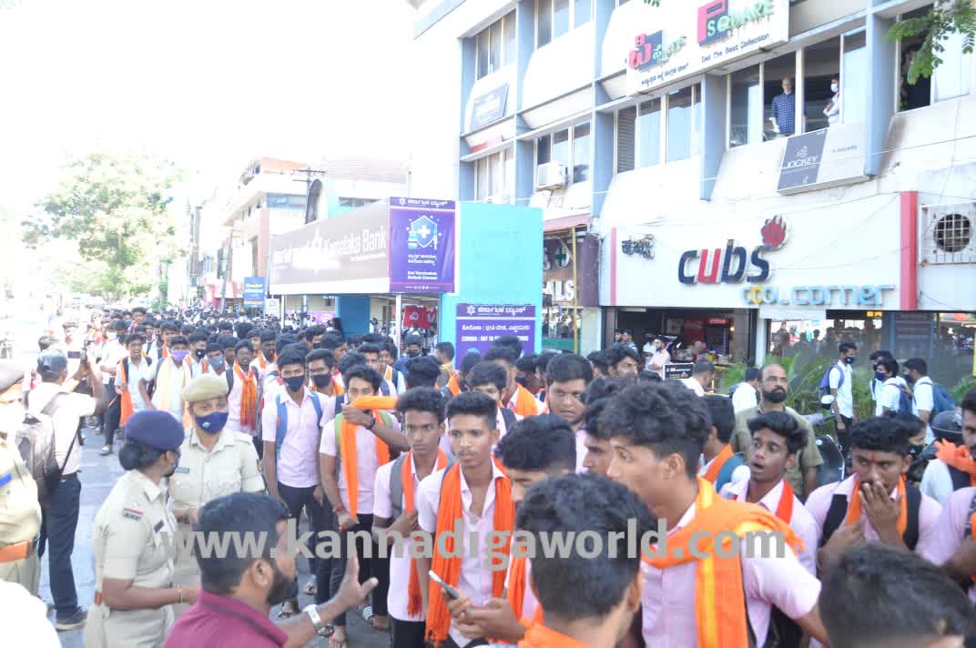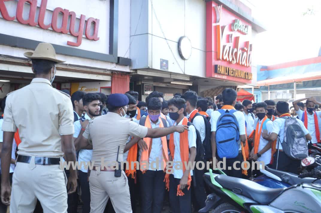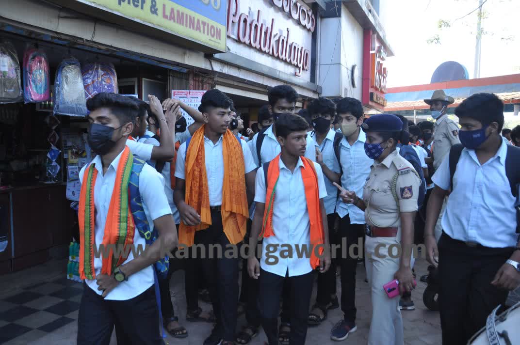 ಭಂಡಾರ್ ಕಾರ್ಸ್ ಕಾಲೇಜಿನ ವಿದ್ಯಾರ್ಥಿಗಳು ಕೇಸರಿ ಶಾಲು ಧರಿಸಿ ಕುಂದೇಶ್ವರ ದೇವಸ್ಥಾನದಿಂದ ಘೋಷಣೆ ಕೂಗುತ್ತಾ ಕಾಲೇಜಿನತ್ತ ಹೆಜ್ಜೆ ಹಾಕಿದರು. ದೊಡ್ಡ ಸಂಖ್ಯೆಯಲ್ಲಿ ವಿದ್ಯಾರ್ಥಿಗಳು ಜೈ ಶ್ರೀರಾಮ್, ಜೈ ಶಿವಾಜಿ ಎಂದು ಘೋಷಣೆ ಕೂಗುತ್ತಾ ಮುಖ್ಯರಸ್ತೆಯಲ್ಲಿ ಸಾಗಿಬಂದು ಕಾಲೇಜಿನ ಆವರಣಕ್ಕೆ ಬಂದರು. ಕಾಲೇಜು ಆಡಳಿತ ಯಾವುದೇ ವಿದ್ಯಾರ್ಥಿಯೂ ಕೇಸರಿ ಶಾಲು, ಹಿಜಾಬ್ ಧರಿಸಿ ಕಾಲೇಜು ಆವರಣ ಪ್ರವೇಶ ಮಾಡಬಾರದೆಂದು ಸೂಚನೆ ನೀಡಿತ್ತು. ಪ್ರತಿಯೊಂದು ವಿದ್ಯಾರ್ಥಿಯನ್ನು ಕಾಲೇಜು ಸಿಬ್ಬಂದಿಗಳು ಗೇಟ್ ಹತ್ತಿರ ತೀವ್ರ ತಪಾಸಣೆ ಮಾಡಿಯೇ ಕಾಲೇಜು ಒಳ ಬಿಟ್ಟರು.