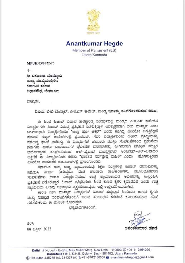 ಬೆಂಗಳೂರು: ಮುಸ್ಕಾನ್ ಬಗ್ಗೆ ತನಿಖೆ ನಡೆಸುವಂತೆ ಬಿಜೆಪಿ ಸಂಸದ ಅನಂತ್ ಕುಮಾರ್ ಹೆಗಡೆ ಅವರು ಮುಖ್ಯಮಂತ್ರಿ ಬಸವರಾಜ ಬೊಮ್ಮಾಯಿ ಅವರಿಗೆ ಪತ್ರ ಬರೆದಿದ್ದಾರೆ.