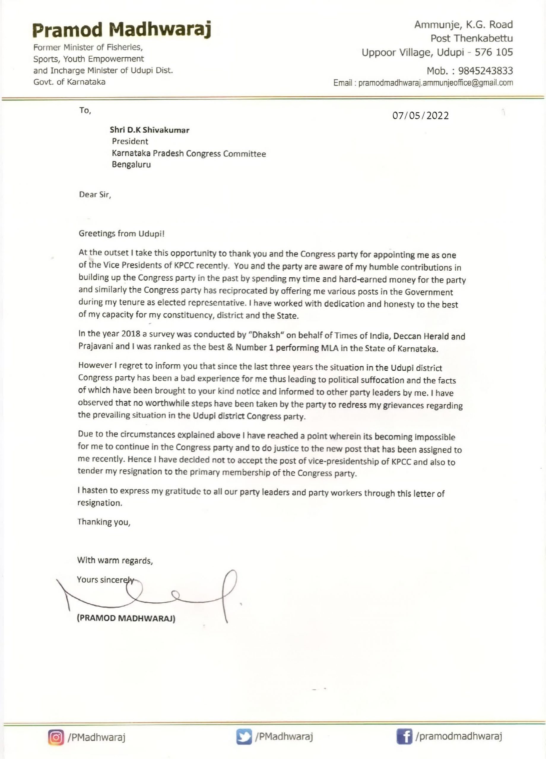 ಕಾಂಗ್ರೆಸ್ ಪಕ್ಷದ ಪ್ರಾಥಮಿಕ ಸದಸ್ಯತ್ವಕ್ಕೆ ಮಾಜಿ ಸಚಿವ ಪ್ರಮೋದ್‌ ಮಧ್ವರಾಜ್‌ ರಾಜೀನಾಮೆ..!