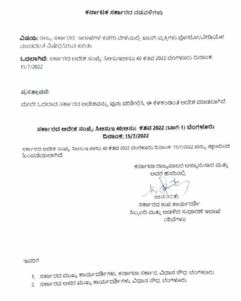 ಸರ್ಕಾರಿ ಕಚೇರಿಗಳಲ್ಲಿ ಫೋಟೋ ವಿಡಿಯೊ ಮಾಡುವುದನ್ನು ನಿಷೇಧಿಸಿ ಸರ್ಕಾರ ಜುಲೈ 15ರಂದು ಆದೇಶ ಹೊರಡಿಸಿದ್ದು ವ್ಯಾಪಾಕ ಠೀಕೆಗಳು ಬಂದಿದ್ದವು. ಈ ನಡುವೆ ಕೆಲವೇ ಗಂಟೆಗಳಲ್ಲಿ ಮತ್ತೆ ಆದೇಶವನ್ನು ಹಿಂಪಡೆದಿದೆ.