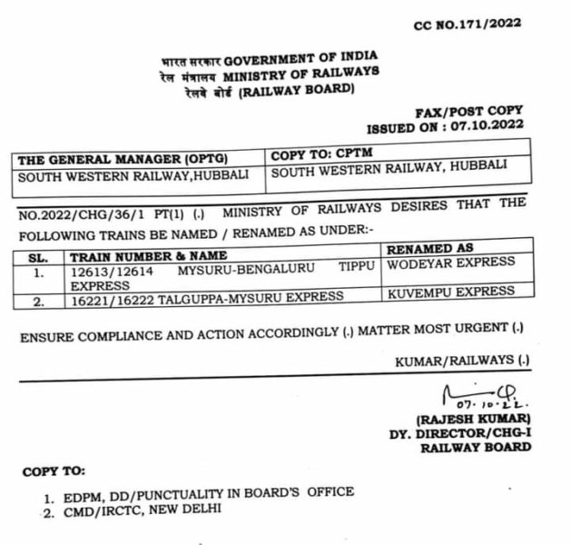 ಟಿಪ್ಪು ಎಕ್ಸ್ ಪ್ರೆಸ್ ರೈಲಿನ ಹೆಸರನ್ನು ‘ಒಡೆಯರ್ ಎಕ್ಸ್ ಪ್ರೆಸ್’ ಎಂದು, ಮೈಸೂರು-ತಾಳಗುಪ್ಪ ಎಕ್ಸ್ ಪ್ರೆಸ್ ರೈಲಿನ ಹೆಸರನ್ನು ‘ಕುವೆಂಪು ಎಕ್ಸ್ ಪ್ರೆಸ್’ ಎಂದು ಮರು ನಾಮಕರಣ ಮಾಡಿರುವುದಾಗಿ ರೈಲ್ವೆ ಮಂಡಳಿ ಉಪ ನಿರ್ದೇಶಕ ರಾಜೇಶ್ ಕುಮಾರ್ ಅವರು ಆದೇಶ ಹೊರಡಿಸಿದ್ದಾರೆ.