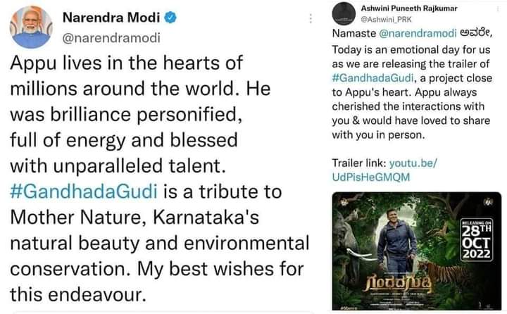ಪುನೀತ್ ರಾಜಕುಮಾರ್ ನಟನೆಯ ಕೊನೆಯ ಸಿನಿಮಾ `ಗಂಧದಗುಡಿ’‌ ಟ್ರೈಲರ್ ರಿಲೀಸ್ ಆಗಿದ್ದು ಈ ಪ್ರಾಜೆಕ್ಟ್ ಬಗ್ಗೆ ಅಶ್ವೀನಿ ಪುನೀತ್ ರಾಜ್‌ಕುಮಾರ್ ಅವರು ಮೋದಿ ಅವರಿಗೆ ಟ್ರೈಲರ್ ಲಿಂಕ್ ಶೇರ್ ಮಾಡಿ, ಟ್ವೀಟ್ ಮಾಡಿದ್ದರು. ಇದೀಗ ಚಿತ್ರದ ಟ್ರೈಲರ್ ನೋಡಿ ಟ್ವೀಟ್ ಮೂಲಕ ಪ್ರಧಾನಿ ಮೋದಿ ಅವರು ಮೆಚ್ಚುಗೆ ಸೂಚಿದ್ದಾರೆ.