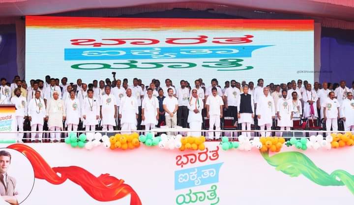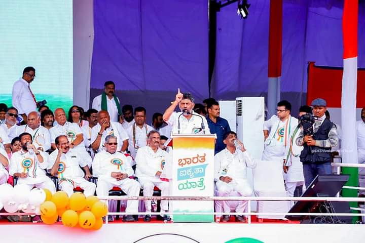 ಬಳ್ಳಾರಿ: ರಾಹುಲ್ ಗಾಂಧಿ ಅವರ ನೇತೃತ್ವದಲ್ಲಿ ನಡೆಯುತ್ತಿರುವ ಭಾರತ ಐಕ್ಯತಾ ಯಾತ್ರೆ ಅಂಗವಾಗಿ ಬಳ್ಳಾರಿಯಲ್ಲಿ ಹಮ್ಮಿಕೊಂಡಿದ್ದ ಬೃಹತ್ ಸಾರ್ವಜನಿಕ ಸಭೆಯಲ್ಲಿ ಕೆಪಿಸಿಸಿ ಅಧ್ಯಕ್ಷ ಡಿ.ಕೆ ಶಿವಕುಮಾರ್ ಮಾತನಾಡಿದರು.