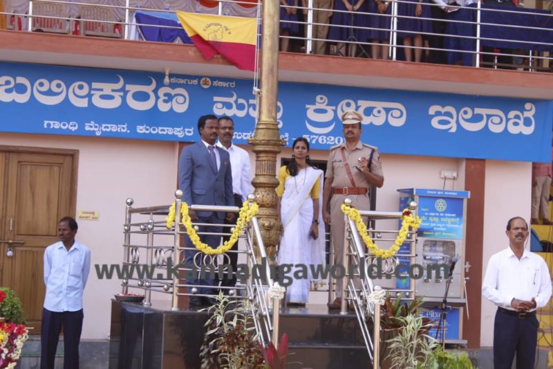 ಕುಂದಾಪುರ ರಾಷ್ಟ್ರೀಯ ಹಬ್ಬಗಳ ಆಚರಣಾ ಸಮಿತಿ, ತಾಲೂಕು ಪಂಚಾಯಿತಿ, ಪುರಸಭೆ ಆಶ್ರಯದಲ್ಲಿ ಗಾಂಧಿ ಮೈದಾನದಲ್ಲಿ ಮಂಗಳವಾರ ನಡೆದ ಕನ್ನಡ ರಾಜ್ಯೋತ್ಸವ ಕಾರ್ಯಕ್ರಮದಲ್ಲಿ ರಾಷ್ಟ್ರಧ್ವಜಾರೋಹಣ ಮಾಡಿ, ಭುವನೇಶ್ವರಿ ತಾಯಿಗೆ ಪೂಜೆ ಸಲ್ಲಿಸಿ, ಗೌರವ ವಂದನೆ ಸ್ವೀಕರಿಸಿ ಅವರು ಮಾತನಾಡಿದರು.