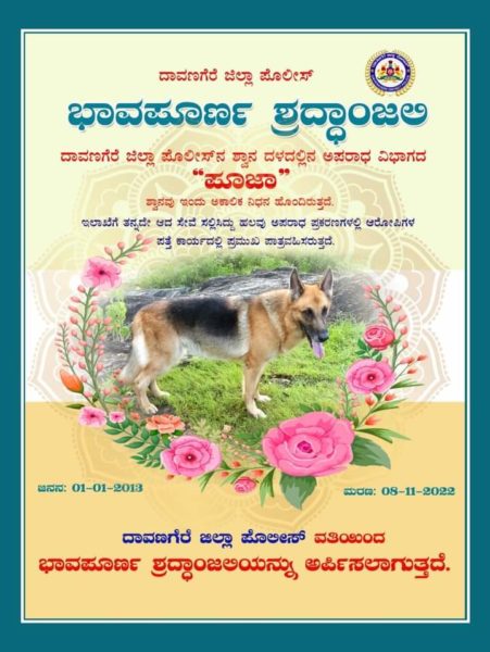 ‘ಪೂಜಾ’ ಹೆಸರಿನ ಶ್ವಾನವು ಜಿಲ್ಲಾ ಪೊಲೀಸ್ ಇಲಾಖೆಯಲ್ಲಿ ಹಲವು ಅಪರಾಧ ಪ್ರಕರಣಗಳ ಪತ್ತೆಕಾರ್ಯದಲ್ಲಿ ಪ್ರಮುಖ ಪಾತ್ರ ವಹಿಸಿತ್ತು. ದಾವಣಗೆರೆ ಜಿಲ್ಲಾ ಪೊಲೀಸ್ ವತಿಯಿಂದ ಮೃತ ಪೂಜಾಗೆ ಭಾವಪೂರ್ಣಶ್ರದ್ಧಾಂಜಲಿ ಅರ್ಪಿಸಲಾಗಿದೆ.