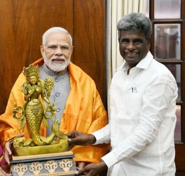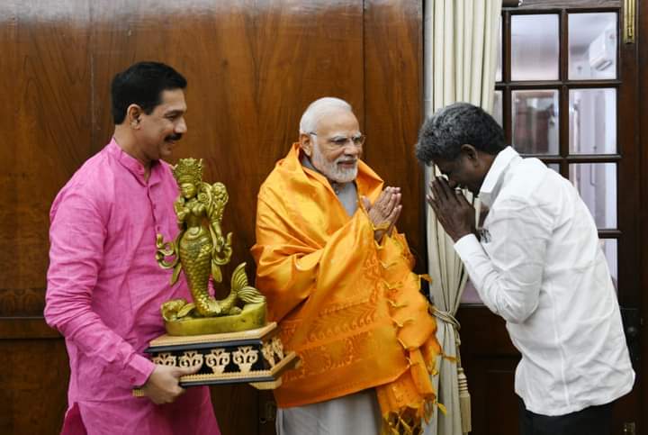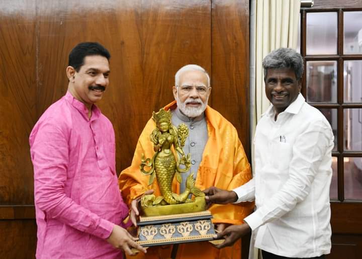 ಬೆಂಗಳೂರು: ನವದೆಹಲಿಯ ಸಂಸತ್ ಭವನದಲ್ಲಿ ಪ್ರಧಾನಮಂತ್ರಿ ನರೇಂದ್ರಮೋದಿ ಅವರನ್ನು ಬಿಜೆಪಿ ರಾಜ್ಯಾಧ್ಯಕ್ಷ ನಳೀನ್ ಕುಮಾರ್ ಕಟೀಲ್ ಅವರೊಂದಿಗೆ ಸಮಾಜ ಕಲ್ಯಾಣ ಮತ್ತು ಹಿಂದುಳಿದ ವರ್ಗಗಳ ಕಲ್ಯಾಣ ಸಚಿವ ಕೋಟ ಶ್ರೀನಿವಾಸ ಪೂಜಾರಿ ಭೇಟಿಯಾದರು. ಇದೇ ವೇಳೆ ಪ್ರಧಾನಿಯವರಿಗೆ ಮತ್ಸ್ಯ ದೇವತೆ ಸ್ಮರಣಿಕೆ ನೀಡಿ ಗೌರವಿಸಿದರು.