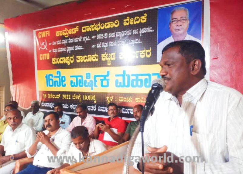 ಅವರು ಭಾನುವಾರ ಕುಂದಾಪುರದ ಹಂಚು ಕಾರ್ಮಿಕರ ಭವನದಲ್ಲಿ ಕಾಮ್ರೇಡ್ ದಾಸಭಂಡಾರಿ ವೇದಿಕೆಯಲ್ಲಿ ನಡೆದ ಕುಂದಾಪುರ ತಾಲೂಕು ಕಟ್ಟಡ ಮತ್ತು ಇತರೆ ನಿರ್ಮಾಣ ಕಾರ್ಮಿಕರ ಸಂಘ (ರಿ) ಸಿಐಟಿಯು 16ನೇ ಮಹಾಸಭೆಯಲ್ಲಿ ಮಾತನಾಡಿದರು.