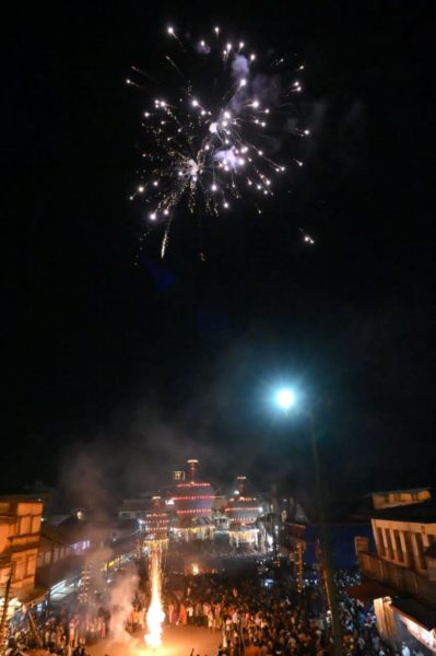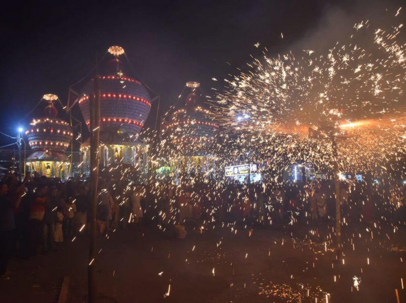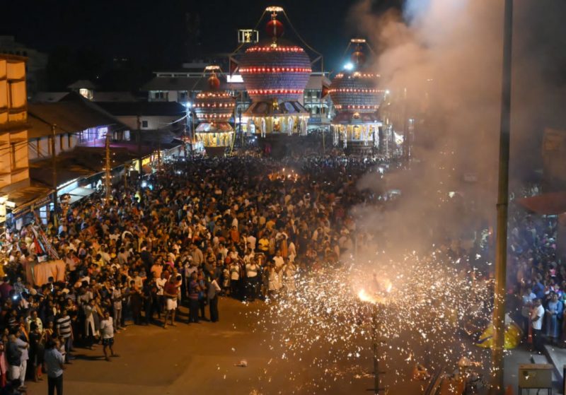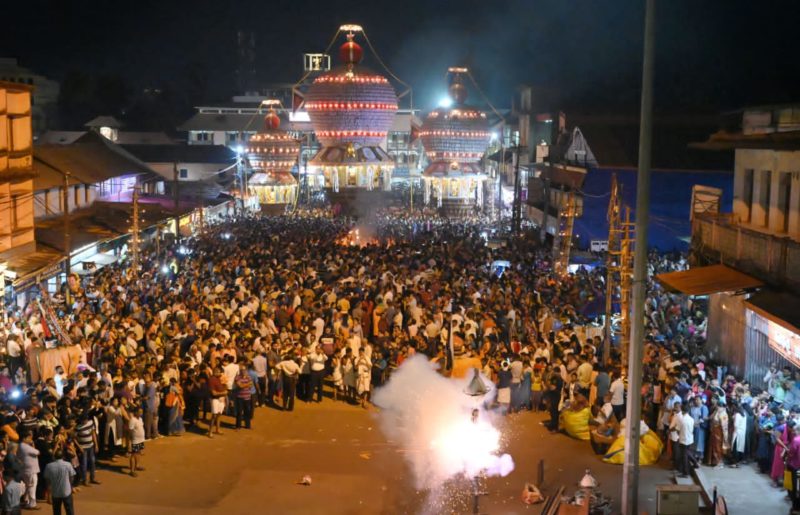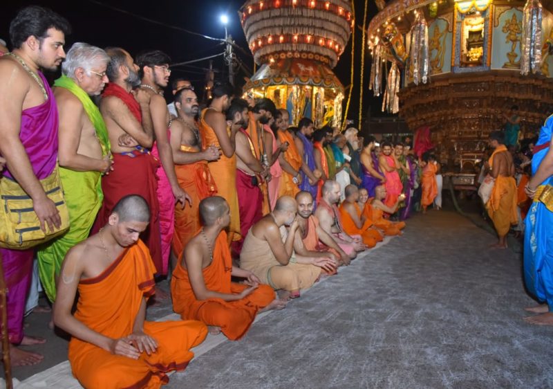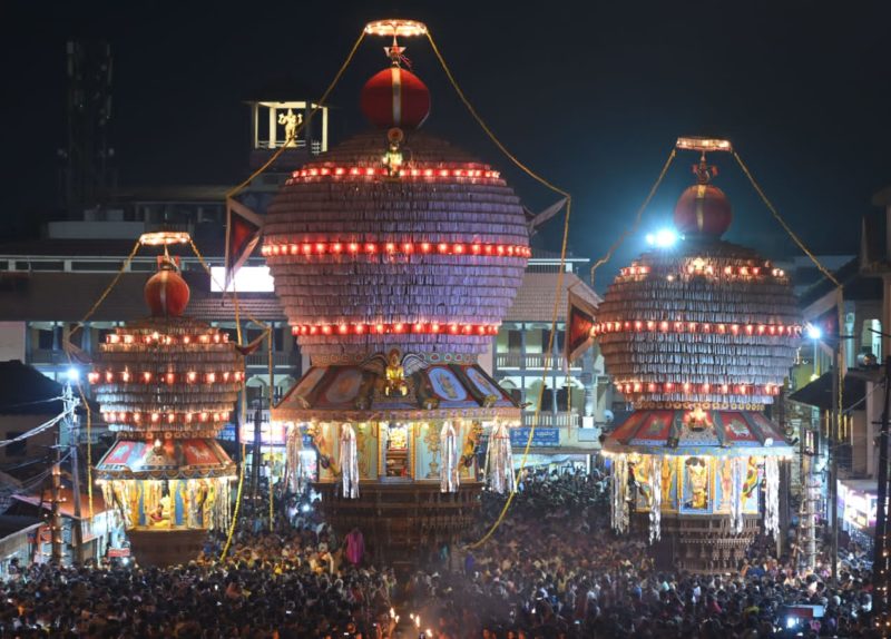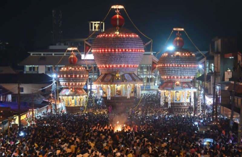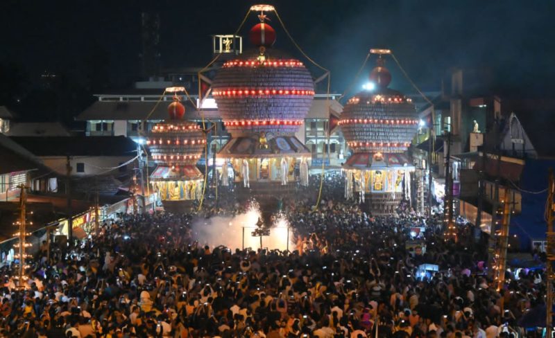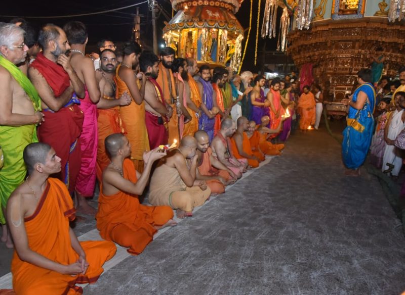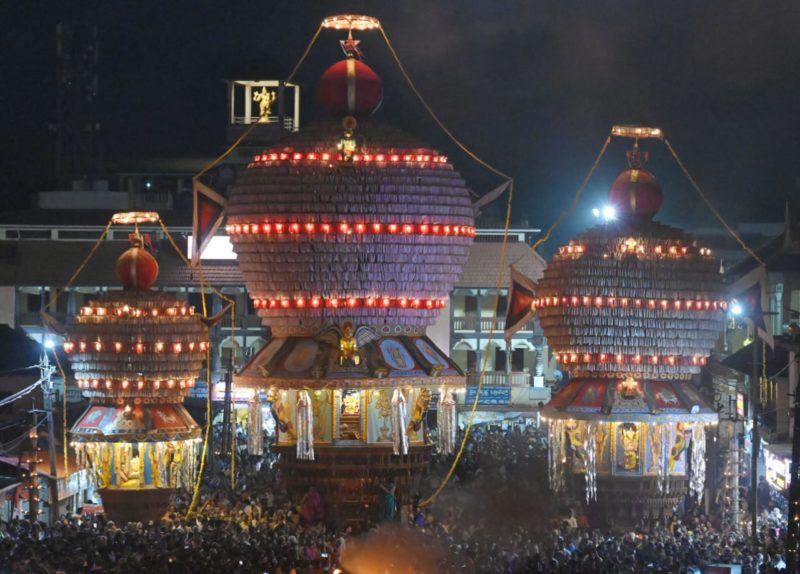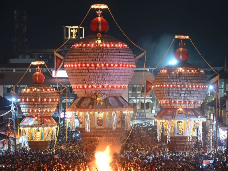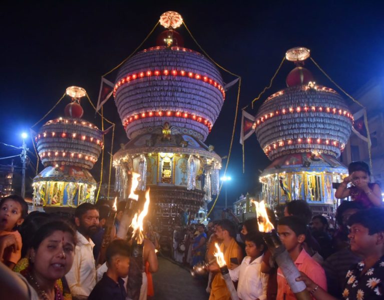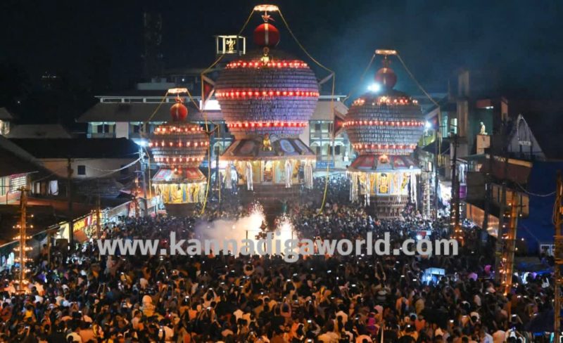 ಭಕ್ತರಿಂದ ಎಳೆಯಲ್ಪಟ್ಟ ಮೂರು ರಥಗಳು ರಥಬೀದಿಯ ದಕ್ಷಿಣ ಭಾಗದಲ್ಲಿ ಒಂದೇ ರೇಖೆಯಲ್ಲಿ ನಿಂತಾಗ ಹಲವಾರು ಸಂಖ್ಯೆಯಲ್ಲಿ ಸೇರಿದ್ದ ಭಕ್ತರು ಜಯಘೋಷ ಮಾಡಿದರು, ರಥಗಳ ಮುಂದೆ ವರ್ಣವೈವಿಧ್ಯ ಅತ್ಯಾಕರ್ಷಕ ಸುಡುಮದ್ದುಗಳನ್ನು ಸಿಡಿಸಿ ಆಕಾಶದಲ್ಲಿ ಬಣ್ಣಗಳ ಚಿತ್ತಾರವನ್ನು ಮೂಡಿಸಲಾಯಿತು.