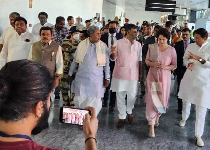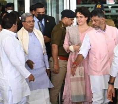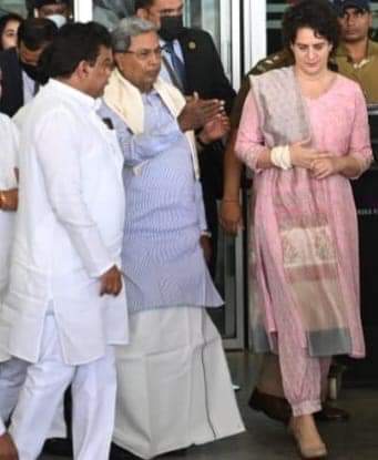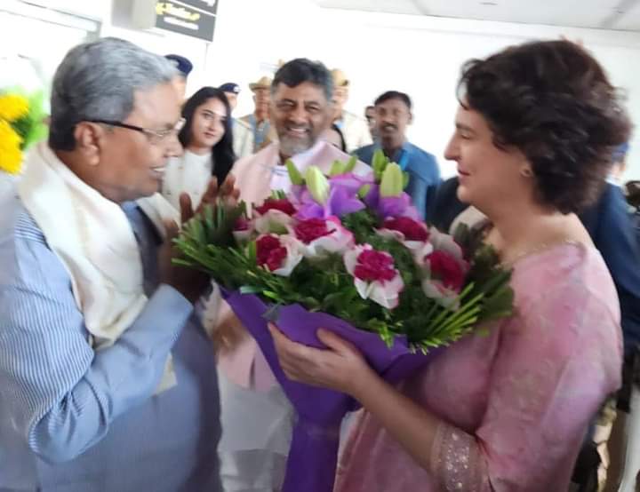 ಬೆಂಗಳೂರು: ನಾ ನಾಯಕಿ ಸಮಾವೇಶದಲ್ಲಿ ಭಾಗವಹಿಸಲು ಇಂದು ಬೆಂಗಳೂರಿಗೆ ಆಗಮಿಸಿದ ಎಐಸಿಸಿ ಪ್ರಧಾನ ಕಾರ್ಯದರ್ಶಿ ಪ್ರಿಯಾಂಕ ಗಾಂಧಿ ಅವರನ್ನು ವಿರೋಧ ಪಕ್ಷದ ನಾಯಕ ಸಿದ್ದರಾಮಯ್ಯ ಅವರು ವಿಮಾನ ನಿಲ್ದಾಣದಲ್ಲಿ ಬರ ಮಾಡಿಕೊಂಡರು.
