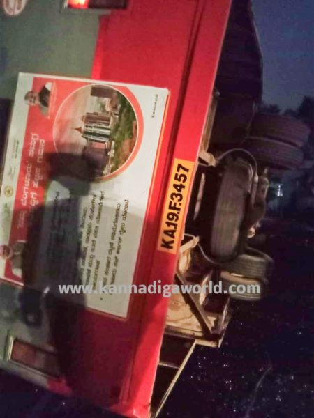ಕುಂದಾಪುರದ ಬಸ್ರೂರು ಮೂರುಕೈ ಬಳಿಯ ಕೆ.ಎಸ್.ಆರ್.ಟಿ.ಸಿ ಡಿಪ್ಪೋದಿಂದ ಹೊರಟು ಬಸ್ ನಿಲ್ದಾಣಕ್ಕೆ ತೆರಳುವ ವೇಳೆ ಇಲ್ಲಿನ ಸಂತೆ ಮಾರುಕಟ್ಟೆ (ಹಳೆ ಆದರ್ಶ ಆಸ್ಪತ್ರೆ) ಎದುರಿನ ಡಿವೈಡರ್ನಲ್ಲಿ ಯೂ ಟರ್ನ್ ತೆಗೆದುಕೊಳ್ಳುವಾಗ ಉಡುಪಿ ಕಡೆಯಿಂದ ಬೈಂದೂರಿನತ್ತ ಸಾಗುತ್ತಿದ್ದ ಲಾರಿಯೊಂದು ಹಿಂಬದಿಯಿಂದ ಬಂದು ಡಿಕ್ಕಿ ಹೊಡೆದ ಪರಿಣಾಮ ಕೆ.ಎಸ್.ಆರ್.ಟಿ.ಸಿ ಬಸ್ ಪಲ್ಟಿಯಾಗಿದ್ದು ಬಸ್ ಚಾಲಕ ಭಾಸ್ಕರ್ ಎನ್ ನಾಯ್ಕ್ ಎನ್ನುವರು ಗಾಯಗೊಂಡು ಸರಕಾರಿ ಆಸ್ಪತ್ರೆಯಲ್ಲಿ ಚಿಕಿತ್ಸೆ ಪಡೆದಿದ್ದಾರೆ. ಲಾರಿ ಚಾಲಕ ಈರಪ್ಪ ಆರ್ ಹಡಗಲಿ ಎನ್ನುವರ ನಿರ್ಲಕ್ಷ್ಯ ಹಾಗೂ ಅತಿ ವೇಗದ ಚಾಲನೆ ಈ ಅಪಘಾತಕ್ಕೆ ಕಾರಣ ಎನ್ನಲಾಗಿದೆ. ಎರಡೂ ವಾಹನಗಳು ಜಖಂ ಗೊಂಡಿದೆ. ರಾಷ್ಟ್ರೀಯ ಹೆದ್ದಾರಿಯಲ್ಲಿ ಘಟನೆ ನಡೆದಿದ್ದು ಕೆಲ ಕಾಲ ವಾಹನ ಸಂಚಾರ ಅಸ್ತವ್ಯಸ್ಥವಾಗಿತ್ತು. ಕುಂದಾಪುರ ಸಂಚಾರ ಪೊಲೀಸ್ ಠಾಣೆ ಪಿಎಸ್ಐ ನಾಸೀರ್ ಹುಸೇನ್ ಹಾಗೂ ಸಿಬ್ಬಂದಿ ಸ್ಥಳಕ್ಕೆ ಭೇಟಿ ನೀಡಿ ಸುಗಮ ಸಂಚಾರಕ್ಕೆ ಅನುವು ಮಾಡಿಕೊಟ್ಟರು. ಆರೋಪಿ ಲಾರಿ ಚಾಲಕನನ್ನು ವಶಕ್ಕೆ ಪಡೆದಿದ್ದಾರೆ.
