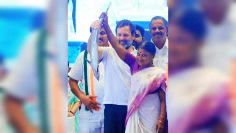 ಮೀನುಗಾರರ ಸಂವಾದದ ಬಳಿಕ ವೇದಿಕೆಯಲ್ಲಿ ಮೀನುಗಾರ ಮಹಿಳೆಯೊಬ್ಬರು ರಾಹುಲ್ ಗಾಂಧಿಗೆ ಅಂಜಲ್ ಮೀನು ಗಿಫ್ಟ್ ನೀಡಿದ್ದಾರೆ. ಮಹಿಳೆ ನೀಡಿದ ಉಡುಗೊರೆಯನ್ನು ರಾಹುಲ್ ಗಾಂಧಿ ಖುಷಿಯಿಂದ ಸ್ವೀಕರಿಸಿದರು.
