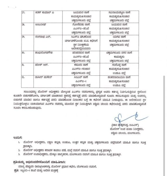 ಮಂಗಳೂರು/ಕುಂದಾಪುರ: ಪಶ್ಚಿಮ ವಲಯದ 32 ಪೊಲೀಸ್ ಸಬ್ ಇನ್ಸ್‌ಪೆಕ್ಟರ್ (ಸಿವಿಲ್) ಗಳನ್ನು ವರ್ಗಾವಣೆ ಮಾಡಿ ಐಜಿಪಿ ಡಾ. ಚಂದ್ರಗುಪ್ತ ಗುರುವಾರ ಆದೇಶ ಹೊರಡಿಸಿದ್ದಾರೆ.
