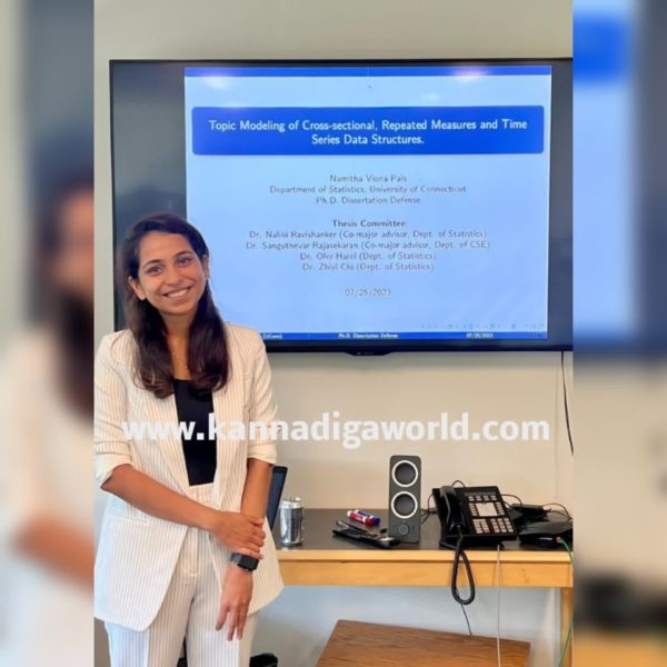 ಕುಂದಾಪುರ: ಉಡುಪಿ ಜಿಲ್ಲೆಯ ಕುಂದಾಪುರ ಮೂಲದವರಾದ ಡಾ.ನಮೀತಾ ವಿಯೊನ್ನಾ ಪಾಯಸ್ ಅವರು ಸಂಖ್ಯಾಶಾಸ್ತ್ರ ವಿಭಾಗದಲ್ಲಿ ‘ಮೊಡಲಿಂಗ್ ಆಫ್ ಕ್ರಾಸ್ ಸೆಕ್ಷನಲ್, ರೀಪಿಟೇಡ್ ಮೇಸರ್ಸ್ ಮತ್ತು ಟೈಮ್ ಸೀರಿಸ್ ಡಾಟಾ ಸ್ಟ್ರಚರ್ಸ್’ ಸಂಶೋಧನಾ ಪ್ರಬಂಧಕ್ಕೆ ಅಮೇರಿಕಾದ ಕನೆಕ್ಟಿಕಟ್ ವಿಶ್ವ ವಿದ್ಯಾಲಯ ಡಾಕ್ಟರೇಟ್ ಪ್ರದಾನ ಮಾಡಿದೆ.
