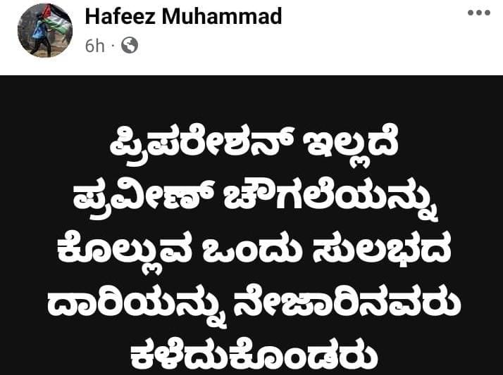 ಉಡುಪಿ ನೇಜಾರಿನ ನಾಲ್ವರ ಕೊಲೆ ಪ್ರಕರಣ ಸಂಬಂಧ ಹಫೀಜ್ ಮೊಹಮದ್ ಎಂಬಾತ ತನ್ನ ಫೇಸ್ಬುಕ್ ಖಾತೆಯಲ್ಲಿ ಪ್ರಚೋದನಾಕಾರಿ ಪೋಸ್ಟ್ ಗಳನ್ನು ಹಂಚಿಕೊಂಡಿದ್ದಾನೆ. ‘ಪ್ರಿಪರೇಶನ್ ಇಲ್ಲದೇ ಪ್ರವೀಣ್ ಚೌಗಲೆಯನ್ನು ಕೊಲ್ಲುವ ಒಂದು ಸುಲಭದ ದಾರಿಯನ್ನು ನೇಜಾರಿನವರು ಕಳೆದುಕೊಂಡರು’ ಎಂದು ಘಟನೆ ಉಲ್ಲೇಖಿಸಿ ಪೋಸ್ಟ್ ಹಾಕಿದ್ದಾನೆ.