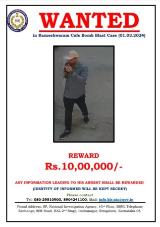 ರಾಮೇಶ್ವರಂ ಕೆಫೆ ಬಾಂಬ್ ಸ್ಫೋಟದ ತನಿಖೆಯನ್ನ ಎನ್ಐಎ ಅಧಿಕಾರಿಗಳು ಕೈಗೆತ್ತಿಕೊಂಡಿದ್ದು, ಇದೀಗ ಬಾಂಬರ್ ಫೋಟೋ ಬಿಡುಗಡೆ ಮಾಡಿದ್ದಲ್ಲದೆ ಈ ಬಾಂಬರ್ ಬಗ್ಗೆ ಸುಳಿವು ನೀಡಿದವರಿಗೆ 10 ಲಕ್ಷ ರೂಪಾಯಿ ಬಹುಮಾನ ನೀಡಲಾಗುವುದು ಎಂದು ಘೋಷಣೆ ಮಾಡಿದ್ದಾರೆ.