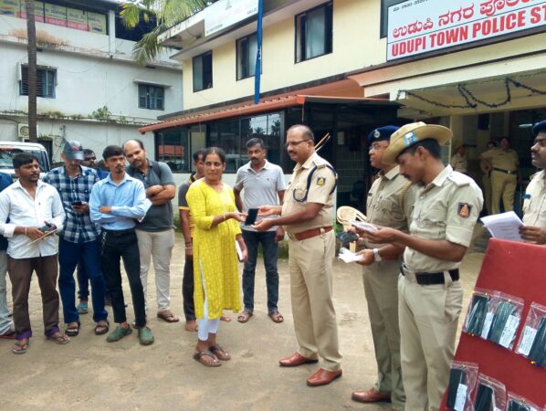 ಉಡುಪಿ: ನಗರ ಠಾಣೆ ವ್ಯಾಪ್ತಿಯಲ್ಲಿ ಕಳವಾಗಿದ್ದ ಸುಮಾರು 30ಕ್ಕೂ ಅಧಿಕ ಮೊಬೈಲ್ ಫೋನ್ಗಳನ್ನು ಸಿಇಐಆರ್ ಪೋರ್ಟಲ್ ಮೂಲಕ ಪೊಲೀಸರು ಪತ್ತೆ ಹಚ್ಚಿದ್ದು, ಅವುಗಳನ್ನು ವಾರಿಸುದಾರರಿಗೆ ನಗರ ಠಾಣೆಯ ಮುಂಭಾಗದಲ್ಲಿ ಹಸ್ತಾಂತರಿಸಲಾಯಿತು.