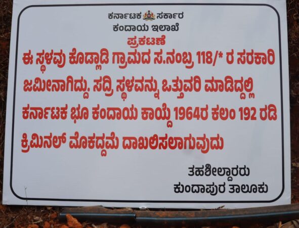 ಒತ್ತುವರಿ ತೆರವುಗೊಳಿಸಲಾಗಿದೆ: ತಹಶಿಲ್ದಾರ್: ಕೊಡ್ಲಾಡಿ ಗ್ರಾಮದ ಸರ್ವೇ ನಂಬರ್ 118/* ರ ಮೂಲತಃ ಸರಕಾರಿ ಜಮೀನಾಗಿದ್ದು ಖಾಸಗಿಯವರು ಒತ್ತುವರಿ ಮಾಡಿಕೊಂಡಿರುವ ಬಗ್ಗೆ ದೂರು ಬಂದ ತಕ್ಷಣ ಮಾಹಿತಿ ಪಡೆದು ಒತ್ತುವರಿ ತೆರವುಗೊಳಿಸಲು ಕಂದಾಯ ನಿರೀಕ್ಷಕರಿಗೆ ಸೂಚಿಸಲಾಗಿತ್ತು. ಈತನ್ಮದ್ಯೆ ಒತ್ತುವರಿ ಮಾಡಿದವರು ಜಾಗದ ಸುತ್ತ ಬೇಲಿ ಅಳವಡಿಸಿದ್ದು ಗುರುವಾರ ವಂಡ್ಸೆ ಹೋಬಳಿಯ ಸಿಬ್ಬಂದಿಗಳು ಒತ್ತುವರಿ ತೆರವುಗೊಳಿಸಿ ಸರಕಾರದ ಸುಪರ್ದಿಗೆ ಪಡೆದಿದ್ದಾರೆ. ಆ ಸ್ಥಳದಲ್ಲಿ ಸರಕಾರಿ ಜಮೀನು ಅತಿಕ್ರಮಿಸಬಾರದು ಎಂದು ಎಚ್ಚರಿಕೆ ಫಲಕ ಅಳವಡಿಸಲಾಗಿದೆ. ಮುಂದಿನ ದಿನದಲ್ಲಿ ಈ ಜಮೀನನ್ನು ಸಾರ್ವಜನಿಕ ಉದ್ದೇಶಕ್ಕಾಗಿ ಕಾಯ್ದಿರಿಸಲು ನಿಯಮಾನುಸಾರ ಕ್ರಮಕೈಗೊಳ್ಳಲಾಗುತ್ತದೆ. -ಪ್ರದೀಪ್ ಕುರ್ಡೇಕರ್ ಎಸ್. (ಕುಂದಾಪುರ ತಹಶಿಲ್ದಾರ್)