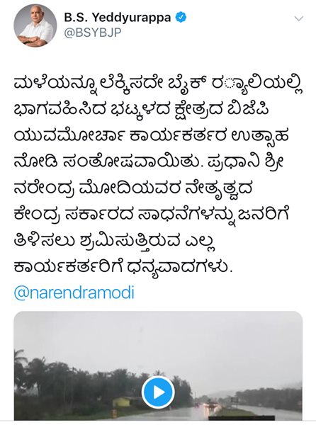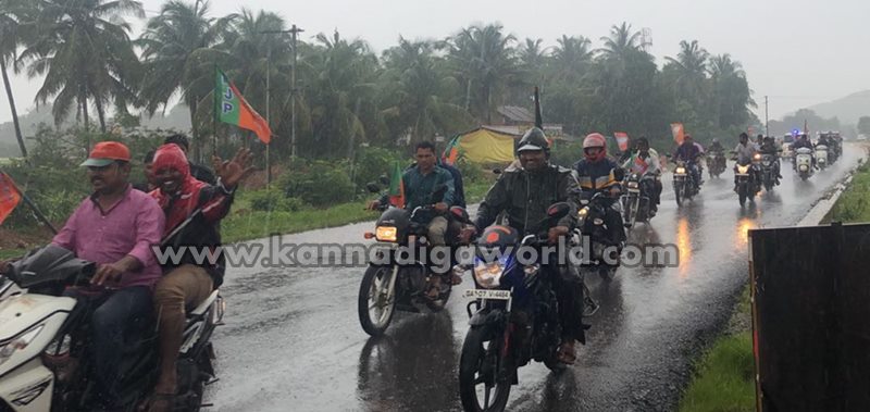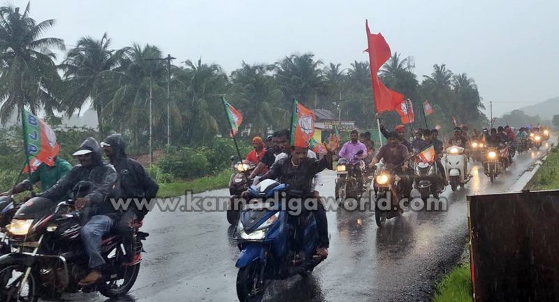 ಭಟ್ಕಳ ಶಾಸಕ ಸುನೀಲ್ ನಾಯ್ಕ ನೇತೃತ್ವದಲ್ಲಿ ತಾಲೂಕಿನ ಬಿಜೆಪಿ ಕಾರ್ಯಕರ್ತರು ಸಂಭ್ರಮಾಚರಣೆ ಹಮ್ಮಿಕೊಂಡಿದ್ದರು. ಆದರೆ ಬೈಕ್ ರ್ಯಾಲಿಗೆ ಚಾಲನೆ ನೀಡುತ್ತಿದ್ದಂತೆ ಮಳೆ ಆರಂಭವಾಗಿದ್ದು ರ್ಯಾಲಿ ಬಂದ್ ಮಾಡದ ಕಾರ್ಯಕರ್ತರು ರ್ಯಾಲಿ ಮುಂದುವರೆಸಿ ಸಂಭ್ರಮಾಚರಣೆ ನಡೆಸಿದರು. ಕಾರ್ಯಕರ್ತರ ಈ ಉತ್ಸಾಹಕ್ಕೆ ಮಾಜಿ ಮುಖ್ಯಮಂತ್ರಿ ಹಾಗೂ ಬಿಜೆಪಿ ರಾಜ್ಯಾಧ್ಯಕ್ಷ ಬಿ.ಎಸ್.ಯಡಿಯೂರಪ್ಪ ಮೆಚ್ಚುಗೆ ವ್ಯಕ್ತಪಡಿಸಿದ್ದು, ಟ್ವಿಟರ್ನಲ್ಲಿ ಹಂಚಿಕೊಂಡಿದ್ದಾರೆ. “ಮಳೆಯನ್ನೂ ಲೆಕ್ಕಿಸದೇ ಬೈಕ್ ರ್ಯಾಲಿಯಲ್ಲಿ ಭಾಗವಹಿಸಿದ ಭಟ್ಕಳದ ಕ್ಷೇತ್ರದ ಬಿಜೆಪಿ ಯುವ ಮೋರ್ಚಾ ಕಾರ್ಯಕರ್ತರ ಉತ್ಸಾಹ ನೋಡಿ ಸಂತೋಷವಾಯಿತು. ಪ್ರಧಾನಿ ಶ್ರೀ ನರೇಂದ್ರ ಮೋದಿಯವರ ನೇತೃತ್ವದ ಕೇಂದ್ರ ಸರ್ಕಾರದ ಸಾಧನೆಗಳನ್ನು ಜನರಿಗೆ ತಿಳಿಸಲು ಶ್ರಮಿಸುತ್ತಿರುವ ಎಲ್ಲ ಕಾರ್ಯಕರ್ತರಿಗೆ ಧನ್ಯವಾದಗಳು” ಎಂದು ಟ್ವೀಟ್ನಲ್ಲಿ ತಿಳಿಸಿದ್ದಾರೆ.