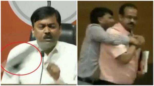 #WATCH Delhi: Shoe hurled at BJP MP GVL Narasimha Rao during a press conference at BJP HQs .More details awaited pic.twitter.com/7WKBWbGL3r