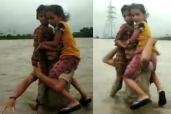 ಭೀಕರ ಪ್ರವಾಹದಲ್ಲಿ ಸಿಲುಕಿದ ಇಬ್ಬರು ಹೆಣ್ಣು ಮಕ್ಕಳನ್ನು ಪೊಲೀಸ್ ಕಾನ್ಸ್ ಟೇಬಲ್ ತನ್ನ ಹೆಗಲ ಮೇಲೆ ಹೊತ್ತು ಸಾಗುವ ಮೂಲಕ ಅವರ ಜೀವ ಉಳಿಸಿದ್ದಾರೆ.