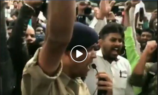 #WATCH Karnataka: DCP of Bengaluru(Central),Chetan Singh Rathore sings national anthem along with protesters present at the Town Hall in Bengaluru, when they were refusing to vacate the place. Protesters left peacefully after the national anthem was sung. #CitizenshipAmendmentAct pic.twitter.com/DLYsOw3UTP