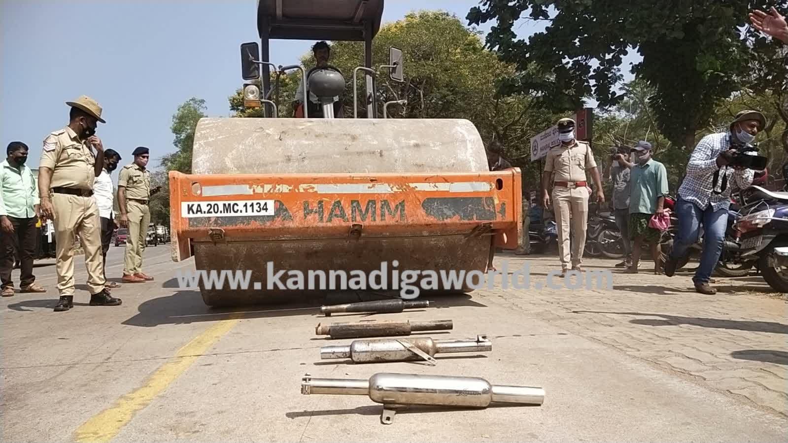 ಕರ್ಕಶ ಶಬ್ದ ಮಾಡುವ ಸೈಲೆನ್ಸರ್’ಗಳನ್ನು ಕಿತ್ತು ರೋಡ್ ರೋಲರ್ ಹತ್ತಿಸಿ ನಾಶಪಡಿಸಿದ ಉಡುಪಿ ಪೊಲೀಸರು..!(Video)