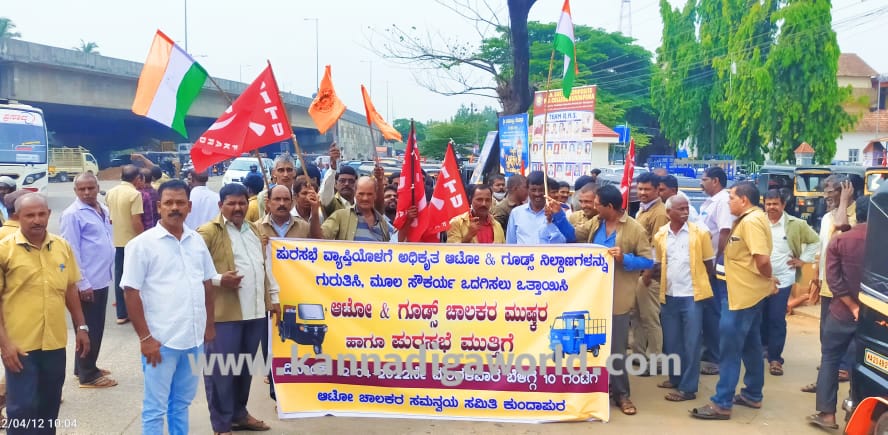 ಕುಂದಾಪುರ: ಇಲ್ಲಿನ ಪುರಸಭಾ ವ್ಯಾಪ್ತಿಯ ಆಟೋ ಚಾಲಕರು ಇಂದು (ಏ.12 ಮಂಗಳವಾರ) ಬಾಡಿಗೆ ಮಾಡದೇ ಆಟೋಗಳ ಸಹಿತ ಕುಂದಾಪುರ ಪುರಸಭೆ ಎದುರು ಆಗಮಿಸಿ ಪ್ರತಿಭಟನೆ ನಡೆಸಿದರು. ಕುಂದಾಪುರ ತಾಲೂಕು ಆಟೋ ರಿಕ್ಷಾ ಮತ್ತು ವಾಹನ ಚಾಲಕರ ಸಂಘಟನೆಗಳ ಸಮನ್ವಯ ಸಮಿತಿ ನೇತೃತ್ವದಲ್ಲಿ ಈ‌ ಮುಷ್ಕರ ನಡೆಸಿ ಬಳಿಕ ಪುರಸಭೆ ಮುತ್ತಿಗೆ ಹಾಕಿ ಪ್ರತಿಭಟನೆ ನಡೆಸಲಾಯಿತು.