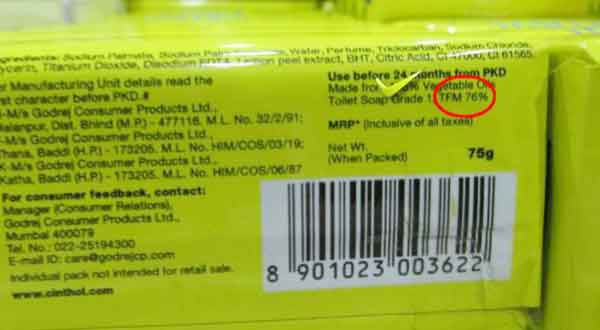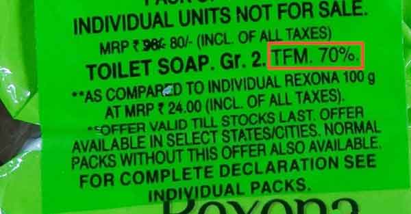 ನೀವು ಬಳಸುತ್ತೀರುವ ಸೋಪನ್ನು ಪ್ಯಾಕಿಂಗ್‌ನ್ನು ಒಮ್ಮೆ ಸರಿಯಾಗಿ ಗಮನಿಸಿ ಅದರ ಟಿ.ಎಫ್.ಎಮ್ ಶೇಕಡಾ 70, ಶೇಕಡಾ 64 ಶೇಕಡಾ 82 ಎಂದು ಬರೆದಿದ್ದರೆ ಅದೇ ಸೋಪಿನ ಗುಣಮಟ್ಟವನ್ನು ತಿಳಿಸುವುದು.