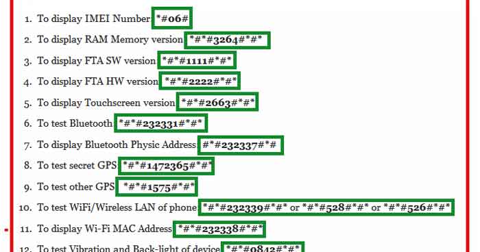 *3001#12345#* – ಫೋನ್ನ ಸಿಗ್ನಲ್ ಮಾಹಿತಿ ನಂಬರ್ (dba) ಗೊತ್ತಾಗುತ್ತದೆ.