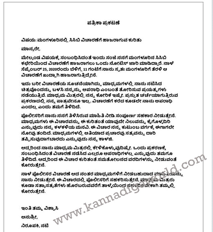 ಇದು ಬರೀ ವಿಚಾರಣೆಯ ಸೂಚನೆಯಾಗಿದ್ದು, ಮಾಧ್ಯಮಗಳಲ್ಲಿ ನಾನು ನಟಿಸಿದ ಚಿತ್ರವೊಂದನ್ನು ಬಳಸಿ ಅಪರಾಧಿ ಎಂಬಂತೆ ತೋರಿಸುವ ಪ್ರಯತ್ನಗಳು ನಡೆಯುತ್ತಿವೆ. ಮಾದಕ ವಸ್ತು ಪ್ರಕರಣದಲ್ಲಿ ನನ್ನ ಪಾತ್ರವೇನೂ ಇಲ್ಲ, ತನ್ನನ್ನು ಅಪರಾಧಿಯಂತೆ ಬಿಂಬಿಸಬೇಡಿ ಎಂದು ಮಾಧ್ಯಮದವರಲ್ಲಿಗೆ ಮನವಿ ಮಾಡಿಕೊಂಡಿರುವ ಅನುಶ್ರೀ ತಾನು ಪೊಲೀಸರಿಗೆ ಸಂಪೂರ್ಣ ಸಹಕಾರ ನೀಡುವುದಾಗಿ ಅವರು ಫೇಸ್ ಬುಕ್ ನಲ್ಲಿ ಬರೆದುಕೊಂಡಿದ್ದಾರೆ.