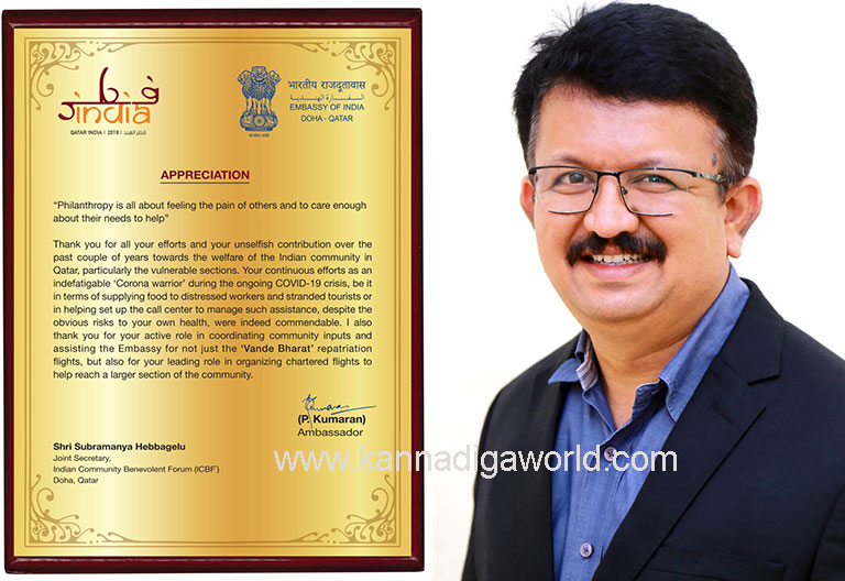 ಸುಬ್ರಮಣ್ಯ ಅವರ ಈ ಮಹತ್ತರ ಸೇವೆಯನ್ನು ಗುರುತಿಸಿ ಮಾನ್ಯ ಭಾರತೀಯ ರಾಯಭಾರಿಗಳು -ಕತಾರ್ ಪ್ರಸಂಸೆಯನ್ನು ನೀಡಿ ಗೌರವಿಸಿದ್ದು ಹೆಮ್ಮೆಯ ವಿಷಯ, ಮತ್ತು ಸುಬ್ರಮಣ್ಯ ಅವರ ಅವರ ಸಮಾಜ ಸೇವೆಯನ್ನು ಗುರುತಿಸಿದ ಕರ್ನಾಟಕದ ಮುಖ್ಯಮಂತ್ರಿಗಳಾದ ಮಾನ್ಯ ಶ್ರೀ ಬಿ. ಎಸ್. ಯಡಿಯೂರಪ್ಪ ಅವರು ಮುಕ್ತ ಕಂಠದಿಂದ ಹೊಗಳಿ ಪತ್ರದ ಮುಖಾಂತರ ಅಭಿನಂದಿಸಿದ್ದಾರೆ.