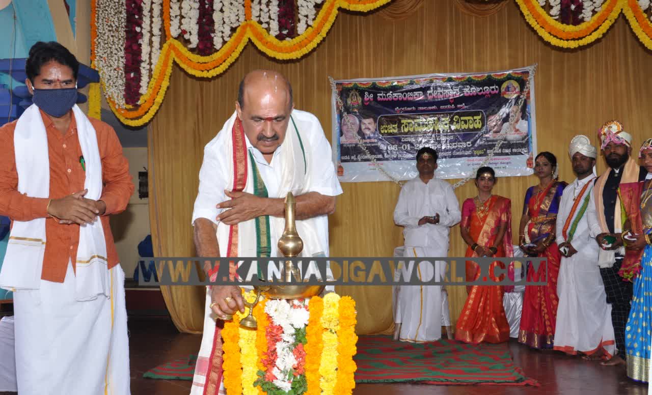 ಬೈಂದೂರು ವಿಧಾನಸಭಾ ಕ್ಷೇತ್ರ ಶಾಸಕರಾದ ಬಿ.ಎಂ ಸುಕುಮಾರ್ ಶೆಟ್ಟಿಯವರು ವಿವಾಹ ಕಾರ್ಯಕ್ರಮವನ್ನು ದೀಪ ಬೆಳಗಿಸಿ ಉದ್ಘಾಟಿಸಿ ಶುಭ ಹಾರೈಸಿ ಮಾತನಾಡಿ, ಅತೀ ಶ್ರೇಷ್ಟವಾದ ಕೊಲ್ಲೂರು ಮೂಕಾಂಬಿಕೆ ಕ್ಷೇತ್ರದಲ್ಲಿ ಮದುವೆಯಾಗುವುದೇ ಯೋಗವಾಗಿದ್ದು ಇಲ್ಲಿ ಮದುವೆಯಾಗಲು ಭಾಗ್ಯ ಬೇಕು. ಸರಕಾರದ ಸಪ್ತಪದಿ ಕಾರ್ಯಕ್ರಮವನ್ನು ಜನರು ಸದುಪಯೋಗಪಡಿಸಿಕೊಳ್ಳಬೇಕು. ಮದುವೆಯಾಗಲು ಲಕ್ಷಾಂತರ ರೂಪಾಯಿ ದುಂದುವೆಚ್ಚ ಮಾಡುವ ಬದಲು ದೇವಸ್ಥಾನದಲ್ಲಿ ಸರಳ ರೀತಿಯಲ್ಲಿ ಮದುವೆ ಮಾಡಿಕೊಳ್ಳುವುದು ಸೂಕ್ತ. ಕೊರೋನಾ‌ ಸಂಬಂಧ ದುಂದು ವೆಚ್ಚಕ್ಕೆ ಕಡಿವಾಣ ಹಾಕಿ ಸರಳ ಸಜ್ಜನಿಕೆಯ ಮದುವೆ ದೇವಸ್ಥಾನದಲ್ಲಿ ವಿಧಿವತ್ತಾಗಿ ನಡೆದರೆ ಅದಕ್ಕೊಂದು ಮಹತ್ವ ಸಿಗಲಿದೆ. ದೇವಸ್ಥಾನದಲ್ಲಿ ಮದುವೆ ಮಾಡುವ ಕಾರ್ಯ ಹೆಚ್ಚೆಚ್ಚು ನಡೆದರೆ ಇಡೀ ದೇಶವೇ ಸುಭಿಕ್ಷೆಯಾಗಲಿದೆ ಎಂದರು.