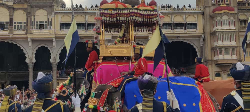 ನಂದಿಧ್ವಜಕ್ಕೆ ಸಿಎಂ ಪೂಜೆ: ಸಂಜೆ 4-36ರಿಂದ 4-46 ಗಂಟೆಯವರೆಗೆ ಅರಮನೆ ಬಲರಾಮ ಧ್ವಾರದಲ್ಲಿ ನಂದಿ ಧ್ವಜ ಪೂಜೆ ನೆರವೇರಿಸಿದ ಮುಖ್ಯಮಂತ್ರಿ ಬಸವರಾಜ ಬೊಮ್ಮಾಯಿ, ವಿಜಯದಶಮಿ ಮೆರಣಿಗೆಗೆ ಚಾಲನೆ ನೀಡಿದರು. ವಿವಿಧ ಕಲಾತಂಡಗಳೊಂದಿಗೆ ಆರು ಸ್ತಬ್ಧ ಚಿತ್ರಗಳು ಮೆರವಣಿಗೆಯಲ್ಲಿ ಸಾಗುವ ಮೂಲಕ ನಾಡಿನ ಕಲೆ, ಸಂಸ್ಕೃತಿ, ಇತಿಹಾಸ, ಸಾಹಿತ್ಯ ಅನಾವರಣಗೊಂಡಿತು. ಮೈಸೂರು ನಗರಾಭಿವೃದ್ದಿ, ಮೈಸೂರಿನ ಬಗ್ಗೆ ಮಾಹಿತಿ ಒಳಗೊಂಡ ಸ್ತಬ್ಧಚಿತ್ರ, ಪರಿಸರ ಇಲಾಖೆಯಿಂದ ‘ಬೇಡ ನನಗೆ ಕೊಡಲಿ, ನೆರಳನೇಕೆ ಕೊಡಲಿ’ ಸ್ತಬ್ಧಚಿತ್ರ, ಕೃಷಿ ಮತ್ತು ತೋಟಗಾರಿಕೆ ಇಲಾಖೆಯಿಂದ ‘ಸಮಗ್ರ ಕೃಷಿ’ ಸ್ತಬ್ಧಚಿತ್ರ, ಆರೋಗ್ಯ ಇಲಾಖೆಯಿಂದ ‘ಕರೊನಾ ಮುಕ್ತ ಕರ್ನಾಟಕ’ ಸ್ತಬ್ಧಚಿತ್ರ, ಮೈಸೂರು ದಸರಾ ಉಪಸಮಿತಿಯಿಂದ ‘ಅರಮನೆ ವಾದ್ಯಗೋಷ್ಠಿ’ ಸ್ತಬ್ಧಚಿತ್ರ, ಆಜಾದ್ ಕಾ ಅಮೃತ ಮಹೋತ್ಸವ ಸ್ತಬ್ಧಚಿತ್ರ ಭಾಗಿಯಾಗಿದ್ದವು. 10ಕ್ಕೂ ಹೆಚ್ಚು ತಂಡಗಳ ಕಲಾವಿದರು ಮೆರವಣಿಗೆಯಲ್ಲಿ ಸಾಗಿದರು.
