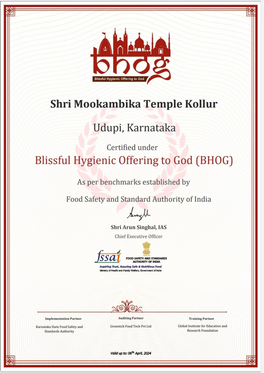ಈ ಎಲ್ಲಾ ಮುನ್ನೆಚ್ಚರಿಕಾ ಕ್ರಮಗಳನ್ನು ಕೈಗೊಂಡು , ಕೊಲ್ಲೂರು ಶ್ರೀ ಮೂಕಾಂಬಿಕ ದೇವಾಲಯಕ್ಕೆ ಆಗಮಿಸುವ ಭಕ್ತಾದಿಗಳಿಗೆ ಅತ್ಯಂತ ಪರಿಶುದ್ದ, ಸುರಕ್ಷಿತ ಮತ್ತು ಗುಣಮಟ್ಟದ ಭೋಜನ ಪ್ರಸಾದವನ್ನು ನೀಡಲಾಗುತ್ತಿದ್ದು, ಭಾರತ ಸರ್ಕಾರದ ಆಹಾರ ಸುರಕ್ಷತೆ ಮತ್ತು ಗುಣಮಟ್ಟ ಪ್ರಾಧಿಕಾರದ ಮುಖ್ಯ ಕಾರ್ಯನಿರ್ವಾಹಕ ಅಧಿಕಾರಿಗಳು ಈ ಪ್ರಮಾಣಪತ್ರವನ್ನು ನೀಡಿದ್ದಾರೆ.