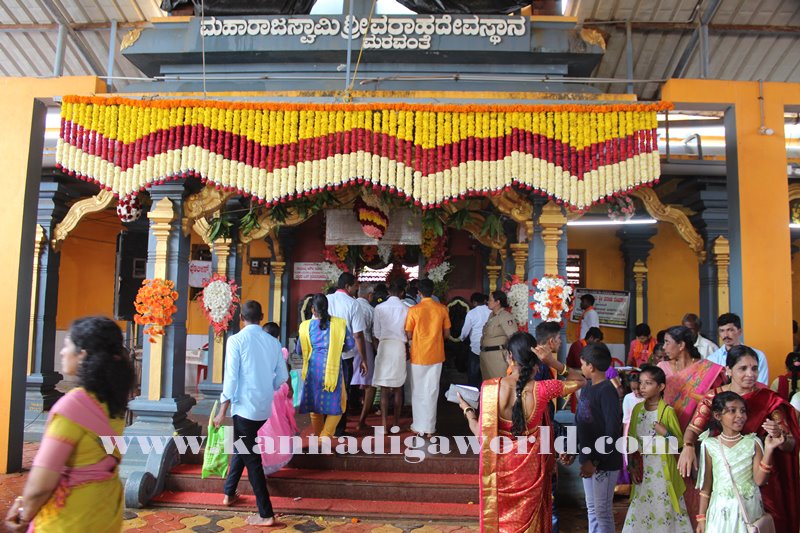ಕುಂದಾಪುರ: ಉಡುಪಿ ಜಿಲ್ಲೆಯ ಮರವಂತೆಯ ಕಾರಣಿಕ ದೇವಸ್ಥಾನವೊಂದರಲ್ಲಿ ಪ್ರತಿವರ್ಷ ನಡೆಯುವ ಜಾತ್ರೆ ಐತಿಹಾಸಿಕ ಹಿನ್ನೆಲೆ ಹೊಂದಿದೆ. ಬೈಂದೂರು ವಿಧಾನಸಭಾ ವ್ಯಾಪ್ತಿಯ ಮರವಂತೆಯ ಶ್ರೀ ವರಾಹ ಸ್ವಾಮಿ ದೇವರ ಜಾತ್ರೆ ಕರ್ಕಾಟಕ ಅಮಾವಾಸ್ಯೆಯ ದಿನ ಸಂಭ್ರಮ ಸಡಗರದಿಂದ ನಡೆಯುತ್ತೆ. ನದಿ ಹಾಗೂ ಸಮುದ್ರದ ನಡುವೆ ಕಂಡುಬರುವ ಪ್ರಕೃತಿ ರಮಣೀಯವಾದ ಧಾರ್ಮಿಕ ಕ್ಷೇತ್ರ ಇದಾಗಿದ್ದು, ಕರ್ಕಾಟಕ ಅಮವಾಸ್ಯೆಯಂದು ಜಾತ್ರೆಗೆ ಕ್ಷೇತ್ರಕ್ಕೆ ಆಗಮಿಸುವ ಸಹಸ್ರಾರು ಭಕ್ತರು ಸಮುದ್ರ ಹಾಗೂ ದೇವಸ್ಥಾನದ ಎದುರಿನ ನದಿಯಲ್ಲಿ ಸ್ನಾನ ಮಾಡಿ ಪುನೀತರಾಗುವ ನಂಬಿಕೆ ಬಹಳ ವಿಶಿಷ್ಟವಾಗಿದೆ. ಇಂದು (ಜು.28 ಗುರುವಾರ) ವೈಭವೋಪೇತವಾಗಿ ಜಾತ್ರೆ ಜರುಗಿತು.